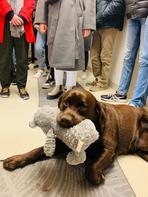 Nach der informativen Präsentation ging es weiter mit einer Führung durch das 400 Jahre alte Gebäude. Für die Behandelten gibt es Werkstätten, in denen mit Holz gearbeitet wird und es beispielsweise die Möglichkeit gibt, seinen eigenen Bogen für das Behandlungsangebot „Bogenschießen“ selbst zu bauen. Des Weiteren wurden die Räume der Ergo- und Arbeitstherapie besichtigt. Dort steht die Arbeit mit kreativen Medien im Vordergrund (z.B. Ton, Holz, Spiel, Musik und Bewegung). Ein Highlight war Therapiehund Theo, den unsere Kolleg*innen kennenlernen durften.