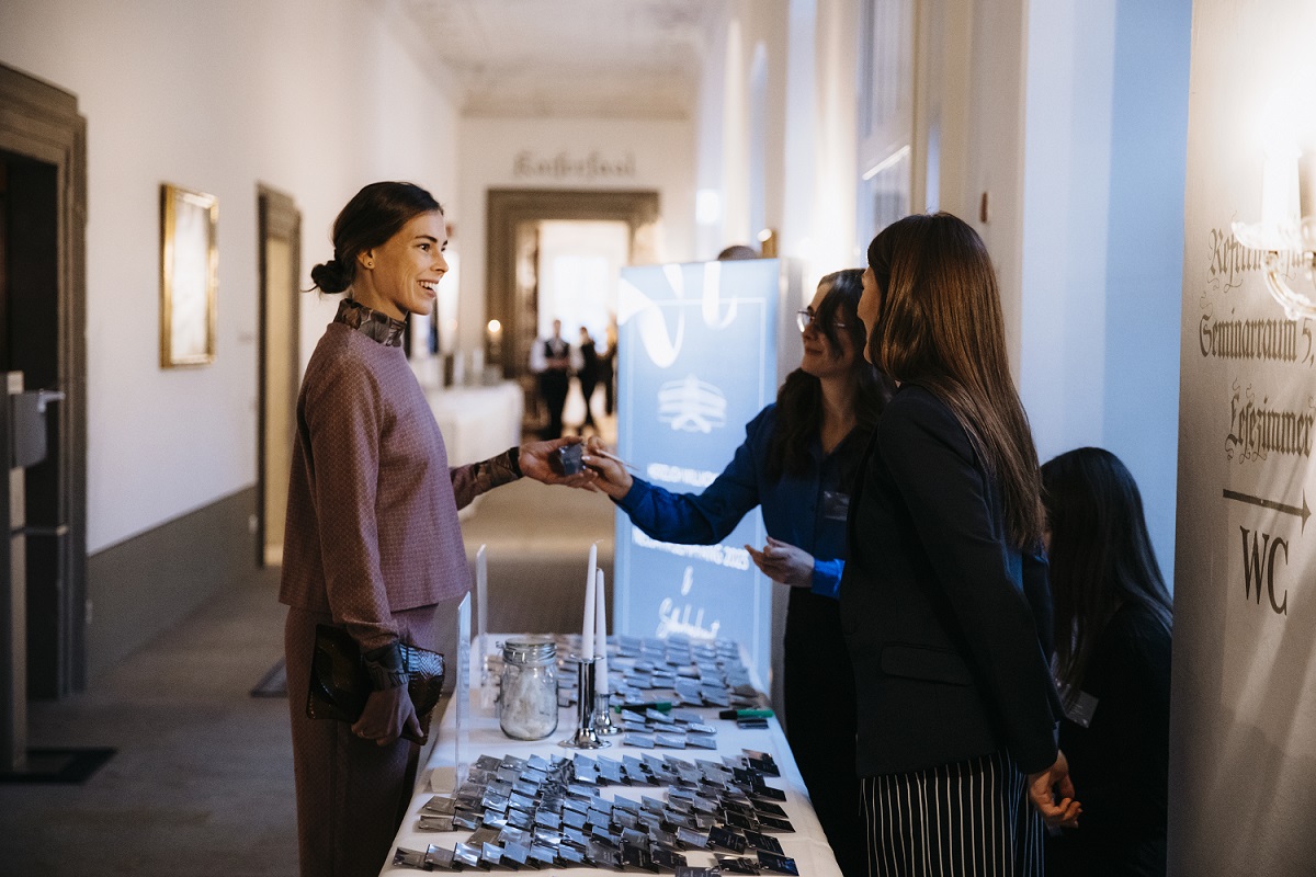 Durch die Vorarbeit, die am Empfangsstand bereits nach der Ankunft auf Kloster Banz geleistet wurde, war das Verteilen der Namensschilder an die eintreffenden Gäste mehr oder weniger unkompliziert. Ein paar Mal musste in dem Getummel aus Namen mit mehr als nur einem Augenpaar danach gesucht werden, doch durch die gegenseitige Unterstützung blieb das Empfangsteam souverän und gelassen. Nachdem als letzter Gast Melanie Huml erschien, fiel die letzte Anspannung ab und nun konnten sich auch Ariane und ihre Kolleg*innen in den Kaisersaal begeben und dem Vergnügungsteil des Abends hingeben.