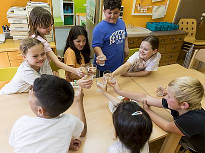 The children come to us early from 6:30 a.m. and there is a flexible breakfast time. This means that everyone can have breakfast at the dining table whenever they want until around 10 am. We offer fruit, muesli, milk, hot chocolate or tea, among other things, but the children also bring something from home. Lunch is also served from 11 am. We prepare this ourselves. During the vacations, the children are also very happy to help with the cooking. Lunch is included in the childcare costs.